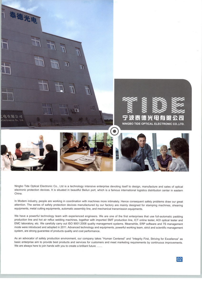 寧波泰德光電有限公司是專(zhuān)業(yè)從事光電保護(hù)裝置設(shè)計(jì)、生產(chǎn)和銷(xiāo)售的科技型企業(yè),坐落于美麗的東方大港北侖,是新興的國(guó)際物流集散中心現(xiàn)代化的工業(yè)企業(yè)中,人與機(jī)器更加密切的協(xié)同工作,安全問(wèn)題隨之更加受到重視。我司生產(chǎn)的安全保護(hù)裝置主要適用于沖壓機(jī)械、剪切設(shè)備、金屬切削設(shè)備、自動(dòng)化裝配線(xiàn)、機(jī)械傳送搬運(yùn)設(shè)備等。 我司擁有一支強(qiáng)大的科技團(tuán)隊(duì),技術(shù)精湛,經(jīng)驗(yàn)豐富,持續(xù)創(chuàng)新。我司率先在行業(yè)內(nèi)引進(jìn)全自動(dòng)貼片生產(chǎn)線(xiàn)和完善的檢測(cè)老化設(shè)備,并擁有進(jìn)口SMT生產(chǎn)線(xiàn),ICT在線(xiàn)測(cè)試儀,AOI光學(xué)測(cè)試儀,EMC實(shí)驗(yàn)室等。公司認(rèn)真貫徹ISO9001:2008質(zhì)量認(rèn)證體系,2011年引進(jìn)ERP軟件,并全面推行“7S”管理模式。先進(jìn)的技術(shù)和設(shè)備,強(qiáng)大的科技團(tuán)隊(duì),嚴(yán)格的科學(xué)管理制度,是我司對(duì)高性?xún)r(jià)比產(chǎn)品的保證。 作為安全生產(chǎn)環(huán)境的維護(hù)者,我司本著“以人為本”的設(shè)計(jì)理念,“誠(chéng)信第一,追求卓越”的企業(yè)宗旨,努力向客戶(hù)提供最好的產(chǎn)品,并通過(guò)持續(xù)改進(jìn),不斷適應(yīng)和滿(mǎn)足市場(chǎng)。同時(shí),我們爭(zhēng)取用最好的服務(wù)來(lái)滿(mǎn)足客戶(hù),感動(dòng)客戶(hù)。我司殷切希望與您一起,攜手并進(jìn),創(chuàng)造更美好的明天。