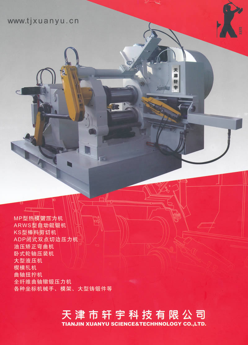 天津市軒宇科技有限公司是在原天津重型機(jī)器集團(tuán)重組后成立的綜合性鍛壓設(shè)備制造公司。長期從事鍛壓設(shè)備的制造和大修工作,尤其是引進(jìn)德國EUMUCO產(chǎn)品后,對熱模鍛壓力機(jī)、閉式雙點切邊壓力機(jī)、棒料剪切機(jī)、輥鍛機(jī)和機(jī)械手、楔橫軋機(jī)及各種液壓機(jī),進(jìn)行生產(chǎn)制造。天津市軒宇科技有限公司擁有高科技人才,具備較高的設(shè)計水平,有豐富的鍛壓產(chǎn)品設(shè)計制造經(jīng)驗和先進(jìn)的技術(shù),能快速制造出卓越、高效、操作方便、完美的鍛壓設(shè)備!及時的售后服務(wù)更加受到廣大用戶的好評!我們的服務(wù)口號是:顧客的需求就是我們的工作目標(biāo)!