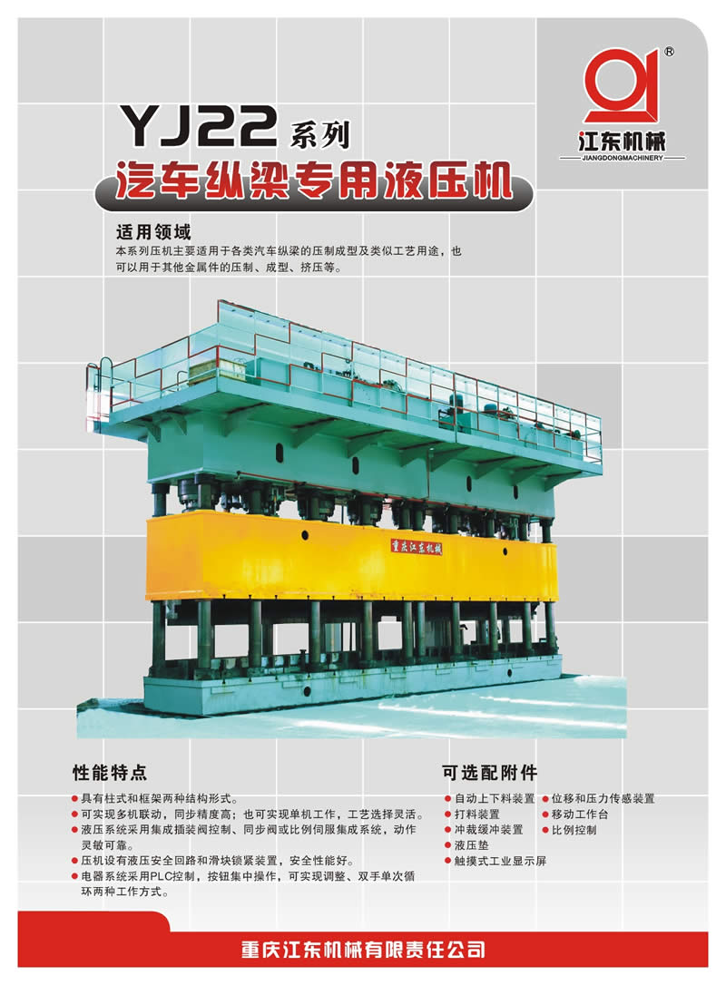 重慶江東機(jī)械有限責(zé)任公司位于中國目前最年輕的直轄市——重慶市萬州區(qū)。江東機(jī)械最早由國民黨軍政部兵工署第27廠改制而成,1937年由南京遷入重慶,經(jīng)過70多年的發(fā)展,目前重慶江東機(jī)械已成為中國西部規(guī)模最大、實(shí)力較強(qiáng)的集液壓機(jī)研發(fā)、設(shè)計(jì)、制造、銷售和服務(wù)一體的大型裝備制造企業(yè)。公司占地456畝,擁有標(biāo)準(zhǔn)廠房8萬余平方米,員工800多人,各類中高級(jí)技術(shù)人才150余人,各類專業(yè)加工設(shè)備200余臺(tái)(套),具備為用戶提供1000KN-100000KN的各種大型、精密液壓機(jī)及成套生產(chǎn)線的綜合能力。目前公司液壓機(jī)類產(chǎn)品有23個(gè)系列,200余種型號(hào),規(guī)格從1000kN至100000kN,適用于金屬材料的壓制、彎曲、翻邊、擠壓成型及非金屬材料如橡膠、塑料、玻璃鋼、絕緣材料和磨料制品的壓制成型,廣泛用于汽車、摩托車、五金、家電、軍工、航天、航空、船舶、鐵路機(jī)車、農(nóng)用機(jī)械、建材、冶金等等行業(yè),并已出口到韓國、日本、印度、巴基斯坦等多個(gè)國家和地區(qū)。公司為中國機(jī)床工具協(xié)會(huì)鍛壓機(jī)械分會(huì)常務(wù)理事單位,中國鍛壓協(xié)會(huì)會(huì)員單位,重慶市高新技術(shù)企業(yè);液壓機(jī)為重慶市名牌產(chǎn)品,江東機(jī)械為重慶市著名商標(biāo)。