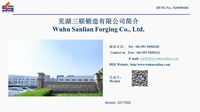 蕪湖三聯(lián)鍛造有限公司位于安徽省蕪湖市高新技術(shù)開發(fā)區(qū)內(nèi)。是一家專業(yè)從事汽車零件鍛造及機(jī)加工的民營企業(yè),三聯(lián)公司總占地面積110畝,總投資2億元人民幣。鍛造生產(chǎn)線20條,年生產(chǎn)鍛件4萬噸。