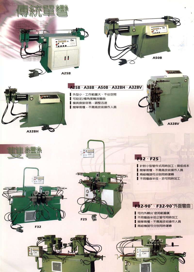 自1984年以來,專業(yè)的經(jīng)營(yíng),結(jié)合三十年的專業(yè)經(jīng)驗(yàn)及不斷追求進(jìn)步的經(jīng)營(yíng)理念,已建立我們公司完整及規(guī)格化的產(chǎn)品生產(chǎn)線,以及在全國(guó)范圍的售前、售后規(guī)范化營(yíng)銷服務(wù)網(wǎng)絡(luò)。現(xiàn)今我們擁有18型至219型不同尺寸規(guī)格的管類加工設(shè)備,機(jī)型齊全,特別是在CNC型三維數(shù)控彎管機(jī)方面有著很強(qiáng)的競(jìng)爭(zhēng)力,系列產(chǎn)品領(lǐng)先于國(guó)內(nèi)其它生產(chǎn)企業(yè),在國(guó)內(nèi)市場(chǎng)上享有較高的聲譽(yù)和市場(chǎng)份額。