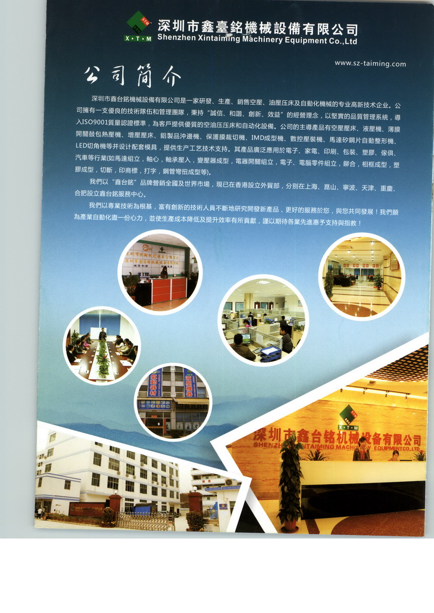 鑫臺銘的產(chǎn)品一直專注于智能壓裝裝備領(lǐng)域,隨著幾年來大力發(fā)展與研發(fā),開發(fā)出有自己的核心技術(shù)且在國內(nèi)處于先進(jìn)地位的產(chǎn)品:液壓機(jī),精密伺服電子壓力機(jī),數(shù)控液壓壓裝機(jī), IMD熱壓成型機(jī),氣動元件,全自動手機(jī)輔料貼標(biāo)機(jī)(自動化環(huán)形線),壓鑄周邊自動化設(shè)備,汽車P檔測試機(jī),一體式電感全自動成型機(jī),通用四軸、六軸機(jī)床工業(yè)機(jī)器人等標(biāo)準(zhǔn)及非標(biāo)機(jī)械,并可配套模具,提供生產(chǎn)技術(shù)支持。產(chǎn)品廣泛應(yīng)用于電子、電器、汽配、機(jī)電、壓鑄、熱壓整型、智能化壓裝、科研單位等行業(yè)。