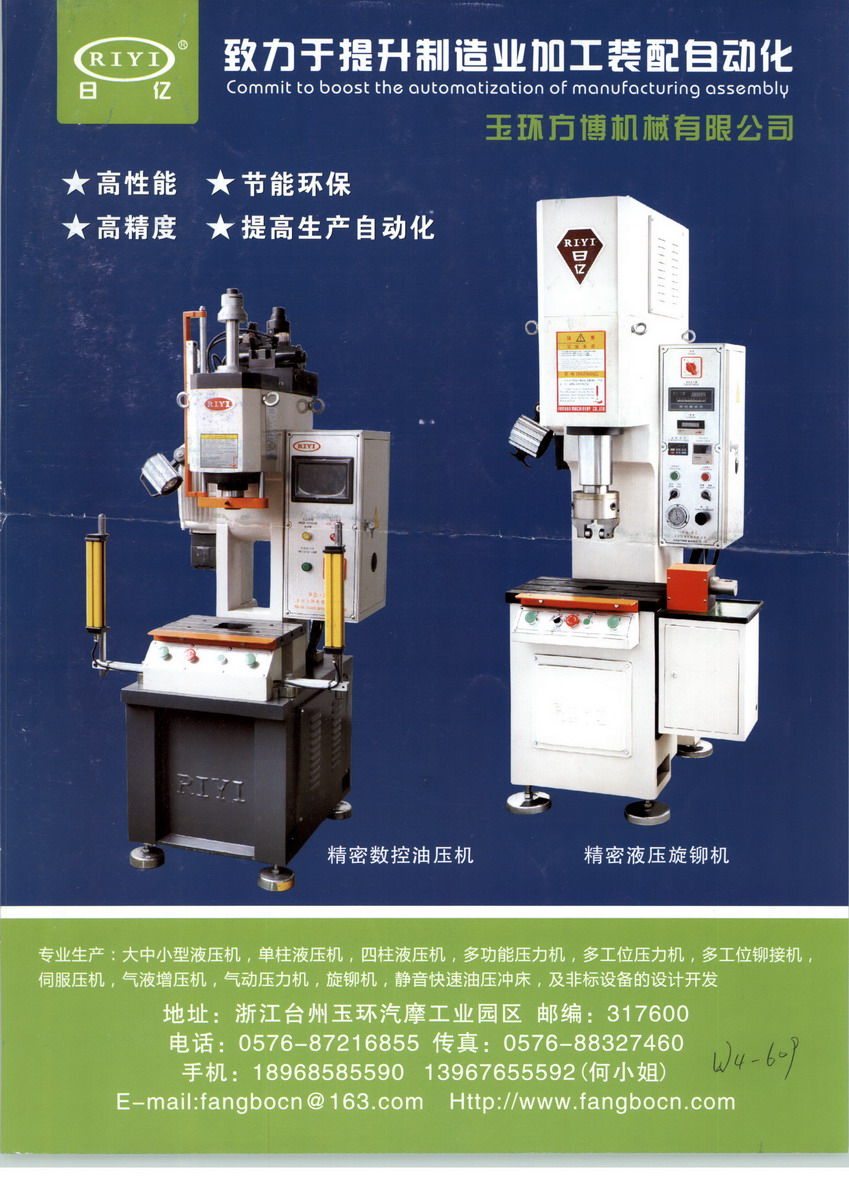 浙江玉環(huán)方博機械有限公司是一家專業(yè)致力于高速單柱液壓機、數(shù)控單柱液壓機、數(shù)控單臂液壓機、數(shù)控小型壓力機、中小型液壓機、單柱液壓機、單臂液壓機、四柱液壓機、數(shù)控液壓機、精密液壓機、全自動液壓機、旋鉚機,鉚接機、鉚釘機、小型壓力機、四柱油壓機、全自動油壓機、弓形油壓機、多功能液壓機、通用液壓機、多工位壓力機、轉(zhuǎn)盤式壓力機、伺服壓力機、伺服壓裝機、伺服沖床,電子壓裝機、伺服液壓機、伺服油壓機、電液伺服壓力機、氣液增壓機、氣動壓力機、氣動沖床、全自動旋鉚機、油壓沖床、數(shù)控油壓機、油壓拉伸機、及各種非標壓力機的設(shè)計開發(fā)、制造與技術(shù)服務(wù)的高新技術(shù)企業(yè)。產(chǎn)品廣泛使用于汽車零部件,家電,五金,橡膠,粉末治金等行業(yè)的裝配-滾壓-拉伸成形-彎曲-鉚壓-熱壓-壓印等加工。本公司在引進德國、日本等國家先進的控制技術(shù)及機床設(shè)計理念的基礎(chǔ)上,結(jié)合國內(nèi)相關(guān)行業(yè)的實際需要,開發(fā)出各種臺式、落地式全系列機床。液壓密封件、氣動密封件、電磁閥、液壓缸等都選用國外知名企業(yè)品牌產(chǎn)品、部分選用國內(nèi)品牌??刂葡到y(tǒng)選用德國西門子PLC、日本歐姆龍、法國斯耐德等知名品牌的電器元件,使設(shè)備性能更加穩(wěn)定,操作方便。本公司機身等鑄件采用精密鑄造,高溫處理、去應(yīng)力退火、正火、自然時效處理等消除內(nèi)應(yīng)力,保證鑄件性能,防止鑄件變形和破壞,氣動床身采用QT450球墨鑄鐵并經(jīng)過各種必要的熱處理保證鑄件性能。本公司擁有一支專業(yè)從事專業(yè)機床設(shè)計、加工與維修服務(wù)的技術(shù)隊伍,能夠獨立完成機械結(jié)構(gòu)、電器與壓力控制系統(tǒng)的設(shè)計;并應(yīng)用現(xiàn)代優(yōu)化設(shè)計理念與分析軟件,進行受力分析和優(yōu)化設(shè)計;能夠自主完成產(chǎn)品的全部機械加工與組裝調(diào)試,可以根據(jù)客戶需要進行各種特殊的非標準機器與模具的設(shè)計和制作,產(chǎn)品生產(chǎn)周期短,并且提供運輸、安裝、調(diào)試等一條龍服務(wù)。本公司的產(chǎn)品曾出口美國,英國,法國,墨西哥,意大利,土耳其,日本,韓國,西班牙,德國,意大利,智利,埃及,泰國等等。玉環(huán)方博機械有限公司是壓力機、中小型液壓機、四柱液壓機、油壓機、氣壓機、增壓機、旋鉚機、多工位壓力機、全自動壓鉚機等產(chǎn)品專業(yè)生產(chǎn)加工的有限責(zé)任公司(自然人投資或控股),公司總部設(shè)在浙江玉環(huán)汽摩配工業(yè)園,玉環(huán)方博機械有限公司擁有完整、科學(xué)的質(zhì)量管理體系。玉環(huán)方博機械有限公司的誠信、實力和產(chǎn)品質(zhì)量獲得業(yè)界的認可。歡迎各界朋友蒞臨玉環(huán)方博機械有限公司參觀、指導(dǎo)和業(yè)務(wù)洽談。