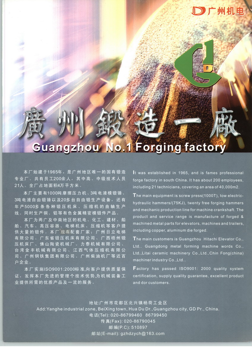 廣州鍛造一廠于2008年11月4日正式改制為廣州鍛造一廠有限公司,是隸屬廣州電氣裝備集團(tuán)有限公司的全資國有的有限責(zé)任公司,是廣州地區(qū)唯一的國有鍛造專業(yè)公司,現(xiàn)已成為廣東乃至周邊地區(qū)鍛造龍頭企業(yè),年銷售額達(dá)1.5億元。主要為鍛壓機(jī)床、陶瓷壓機(jī)、港口機(jī)械、柴油機(jī)和石油管道等提供鍛件毛坯、半成品及成品。 主要設(shè)備有:雙臂自由鍛電液錘、單臂自由鍛電液錘以及多臺自由鍛生產(chǎn)設(shè)備、1000T摩擦壓力機(jī)、3T電液模鍛錘,本公司參股的廣州清水銀禾鍛造有限公司,可以供給銅、鋁等有色金屬及汽車等精密模鍛產(chǎn)品;子公司——廣州越鑫曲軸制造有限公司擁有一整套年產(chǎn)10000多條各種鍛壓機(jī)床、壓縮機(jī)的曲軸和直軸機(jī)加工專業(yè)生產(chǎn)線。 2008年投資建設(shè)的2000噸油壓機(jī)項(xiàng)目占地2000多平米,新車間的配套設(shè)施相當(dāng)完善。 可生產(chǎn)拔長單件15T,鐓粗單件8T的鍛件。 本公司經(jīng)中國船級社船質(zhì)量體系認(rèn)證,實(shí)施ISO09001:2008標(biāo)準(zhǔn),并獲得中國船級社船用產(chǎn)品公廠認(rèn)可,擁有完善的檢驗(yàn)設(shè)備,向客戶提供質(zhì)量保證,發(fā)揮本公司先進(jìn)的管理和技術(shù)優(yōu)勢,為機(jī)械裝備工業(yè)和船用產(chǎn)品提供所需的優(yōu)質(zhì)產(chǎn)品及一流的服務(wù)。