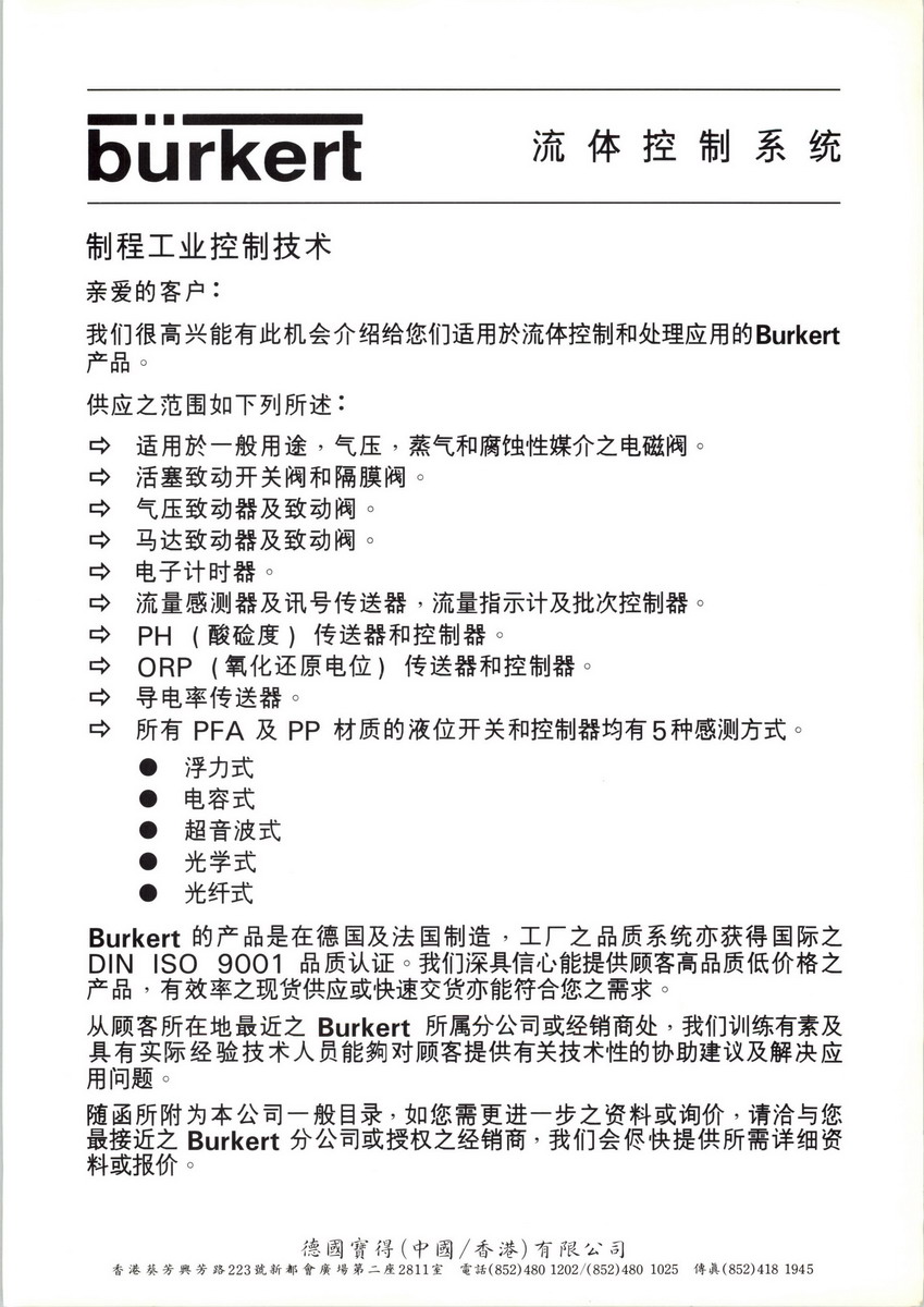 德國寶德burkert公司的一個品牌,專業(yè)從事過程產(chǎn)品,如電磁閥,蝶閥,球閥,角座閥,止回閥,過濾器,氣動驅(qū)動,傳感器和控制器等生產(chǎn)銷售。目前在全世界有4個研發(fā)中心5個生產(chǎn)地點35附屬公司,3000多員工(至2013年)。我們提供全球性的經(jīng)驗,你可以依靠。寶得是一個適應(yīng)性強的組織,靈活的流程。我們不斷致力于取得成功,既為我們的客戶和我們自己。一致和持續(xù)的研發(fā)和員工培訓的投資,使我們能夠為客戶提供最好的技術(shù)和服務(wù)。提出任何要求或目標,你可能有流體過程控制,寶得可以依靠和你一起工作,我們會發(fā)現(xiàn)最好的解決方案,無論從技術(shù)和經(jīng)濟的角度來看。寶得增長,銷售在國外的活動已經(jīng)展開,越來越多的附屬公司在主要的工業(yè)化國家的支持。我們的全球存在,使我們能夠?qū)W⒂谔囟ㄊ袌鲎铌P(guān)切的問題,同時為客戶提供最有效的解決方案,在他們的國家。六十多年來,德國寶德burkert公司一直致力于流體控制領(lǐng)域的產(chǎn)品和系統(tǒng)的研發(fā)、制造。如今德國寶德burkert公司已發(fā)展成一個擁有三千多名員工、在德國,法國及中國擁有五家生產(chǎn)廠。在全球四十多個國家和地區(qū)設(shè)立了分公司的跨國集團,成為流體控制系統(tǒng)領(lǐng)域的全球領(lǐng)先者。德國寶德burkert公司在長期的發(fā)展過程中,非常重視技術(shù)創(chuàng)新和新品開發(fā)。通過針對性的產(chǎn)品設(shè)計、現(xiàn)代化和加工工藝、嚴格認真的質(zhì)量檢驗和切實的市場預測,形成了以“通用電磁閥系統(tǒng)”“過程控制閥系統(tǒng)”“氣動控制閥系統(tǒng)”“液體分析閥系統(tǒng)”以及“傳感器/變送器”和 “控制器”為主體的六大系列產(chǎn)品?;凇癇urkert”產(chǎn)品精巧的設(shè)計、卓越的性能和完善的服務(wù),使“Burkert”產(chǎn)品在流 體控制領(lǐng)域始終處于領(lǐng)先地位。 “Burkert”生產(chǎn)的 “環(huán)氧樹脂封裝線圈”以及“電纜連接插頭 ”已成為國際ISO質(zhì)量標準。德國寶德burkert公司發(fā)明的 “先導銜鐵電磁系統(tǒng)”“搖臂式電磁閥”及“脈沖 線圈”就是公司不斷創(chuàng)新發(fā)展的最佳例證。目前,Burkert專業(yè)化的流體控制系統(tǒng)產(chǎn)品已廣泛應(yīng)用于各行各業(yè),尤其在水/污水處理、啤酒飲 料、食品加工、制藥及醫(yī)療設(shè)備、消毒清洗、及紡織化工等領(lǐng)域更是有著極大的優(yōu)勢和廣闊的市場前 景。而且在一些極端苛刻的工作情況下,如衛(wèi)星、太空試驗室、核反應(yīng)堆及深海探測裝中,“Burkert”產(chǎn)品也顯示了其精確性和可靠性. 隨著中國工業(yè)的不斷發(fā)展,德國寶德burkert公司將以其先進的產(chǎn)品、優(yōu)良的品質(zhì)、周到的服務(wù)致力于中國工業(yè)化水平的進一步提高,同時組建了香港、上海、成都、蘇州、北京、廣州辦事處。以此為依托為廣大客戶更加及時準確地供貨,提供相應(yīng)的技術(shù)服務(wù)和培訓,并針對客戶的應(yīng)用要求提供最專業(yè)、最周到的服務(wù)。