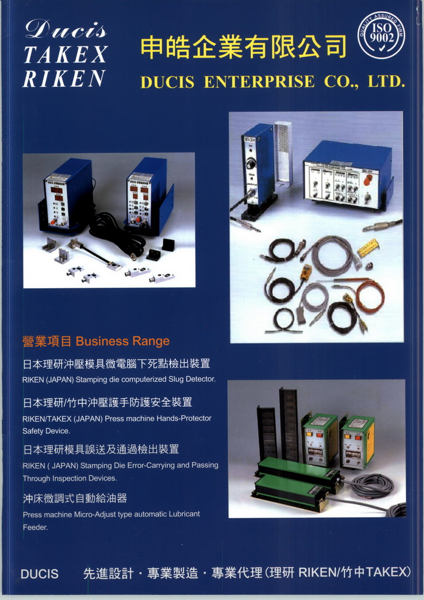 申皓企業(yè)有限公司於民國七十八年成立至今已有二十二年,公司參考先進國家技術(shù),專業(yè)設(shè)計、製造生產(chǎn)與銷售沖床周邊自動化系列的機械設(shè)備。 主要生產(chǎn)微電腦下死點檢出器、模具誤送及通過檢出裝置、沖床護手防護安全裝置、不銹鋼附自動電磁閥給油桶。更是日本二大光電產(chǎn)品理研、竹中之代理商: 日本理研主要產(chǎn)品:沖床光電護手、荷重監(jiān)視器、誤送檢知、下死點檢知 日本竹中主要產(chǎn)品:沖床光電護手 申皓企業(yè)有限公司之產(chǎn)品行銷於世界各地,以優(yōu)良的品質(zhì)、熱忱、高效、優(yōu)質(zhì)的售後服務(wù) 而受到廣大客戶群的技持與愛護,為滿足消費者之需求及方便性,公司於東莞、昆山等地 設(shè)立分公司及辦事處,以便及時服務(wù)客戶。長久以來,因產(chǎn)品品質(zhì)的不斷改進及定期 為客戶做產(chǎn)品檢修與服務(wù),得到客戶的大力支持與高度信賴,造就申皓在商業(yè)界的良好形 象。與此同時 ,產(chǎn)品的品質(zhì)也贏得了客戶的一致好評。
